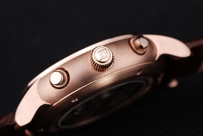 Crown: rosa de 18 quilates chapado en oro de la corona calado con el logotipo de Audemars Piguet y dos coronas con teclas más pequeñas a cada lado de it