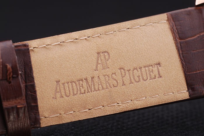 Bracelet de acero inoxidable: correa de piel de cocodrilo marrón con calor en relieve el nombre y el logotipo de Audemars Piguet y un Audemars Piguet inscriben rosa de 18 quilates chapado en oro-flip-sobre el gancho clasp