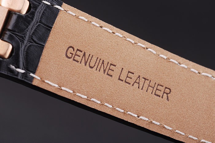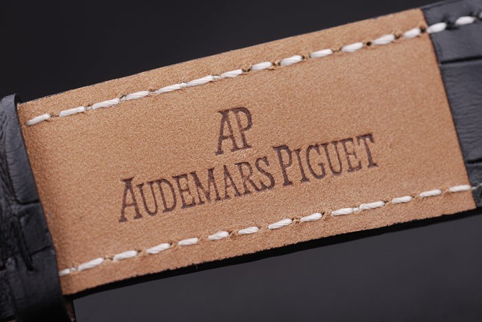Bracelet de acero inoxidable: correa de piel de cocodrilo Negro con costuras en hilo blanco y el calor en relieve Audemars Piguet nombre y el logotipo y un Audemars Piguet inscriben rosa bañados en oro flip-sobre el gancho clasp