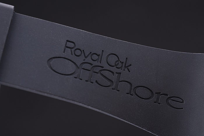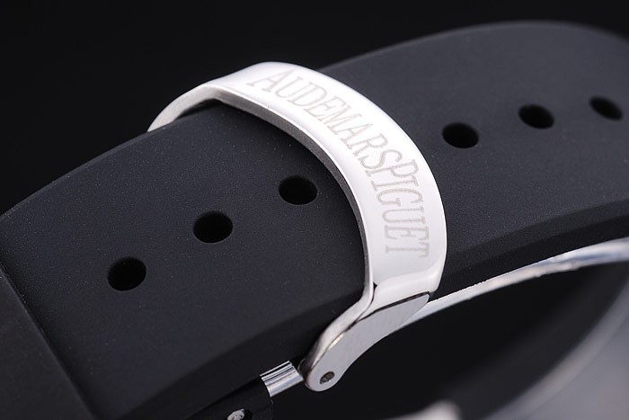 Bracelet: correa de caucho Negro con relieve de calor sello Audemars Piguet Royal Oak Offshore y un Audemars Piguet inscrito inoxidable acero abatible sobre el gancho clasp