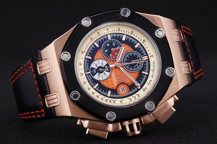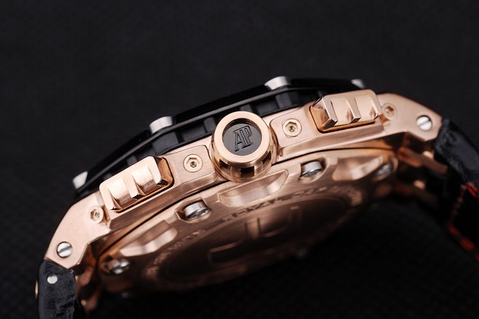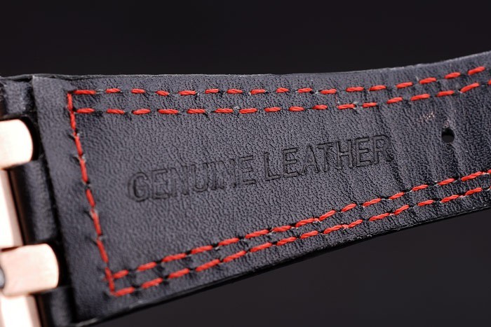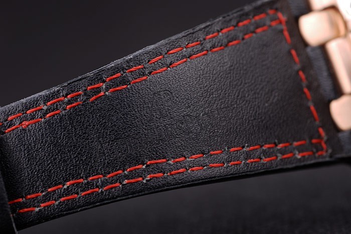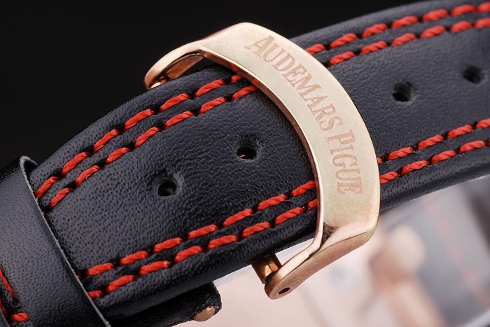 Bracelet: Calor en relieve logotipo de Audemars Piguet Swiss Made y correa de cuero negro con doble costura hilo rojo y Audemars Piguet grabado de oro rosa plateado gancho hebilla clasp
