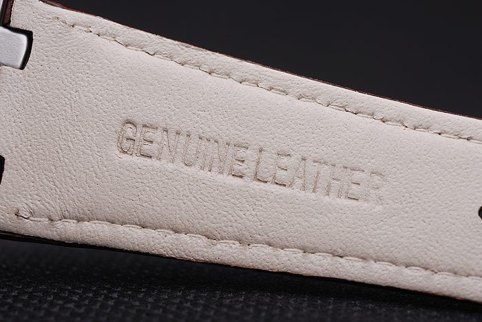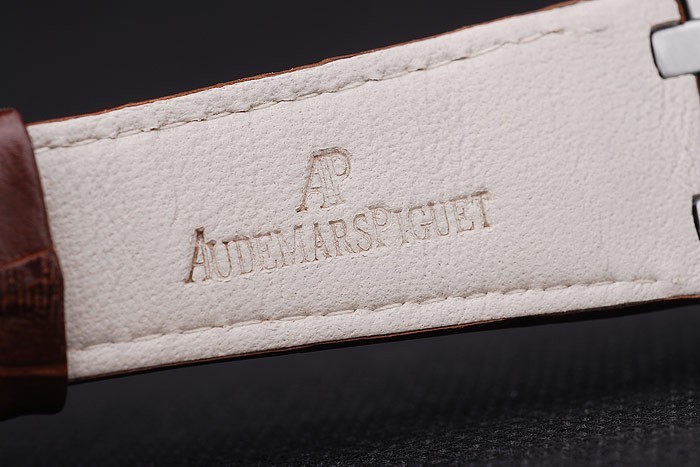 Bracelet: correa de piel de cocodrilo marrón con costuras de hilo blanco y en relieve de calor nombre de Audemars Piguet y el logotipo y un Audemars Piguet inscriben acero inoxidable flip-sobre el gancho clasp