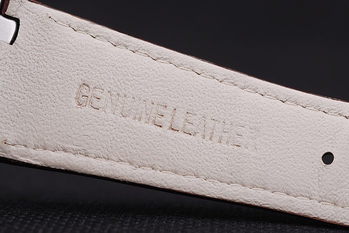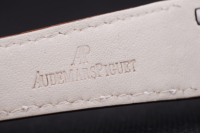 Bracelet: correa de piel de cocodrilo marrón con costuras de hilo blanco y en relieve de calor nombre de Audemars Piguet y el logotipo y un Audemars Piguet inscriben acero inoxidable flip-sobre el gancho clasp