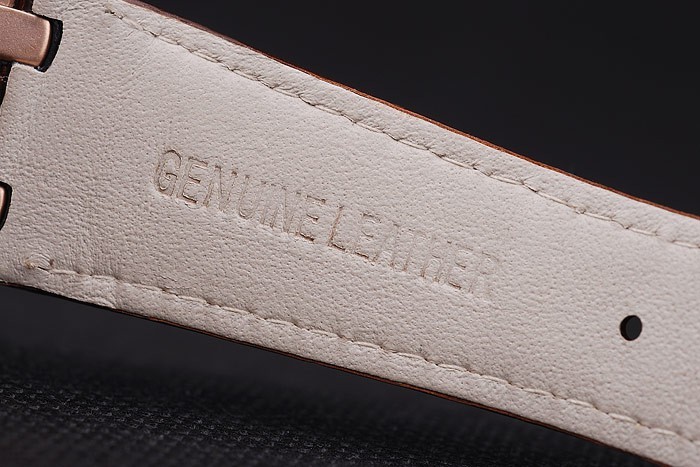 Bracelet de acero inoxidable: correa de piel de cocodrilo marrón con costuras de hilo blanco y en relieve de calor nombre y el logotipo de Audemars Piguet y un Audemars Piguet inscriben rosa bañados en oro flip-sobre el gancho clasp