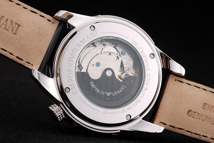 Volver: Acero inoxidable cepillado atornillado atrás con transparencia en el centro y el logotipo de Emporio Armani y engravings