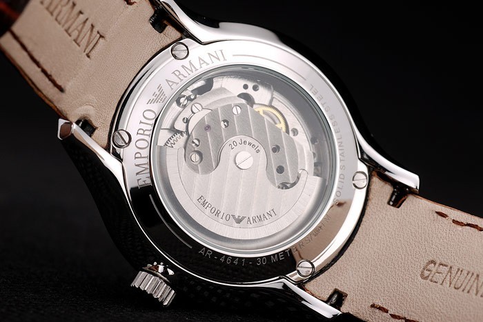 Volver: Acero inoxidable pulido atornillado atrás con transparencia en el centro y Emporio Armani engravings