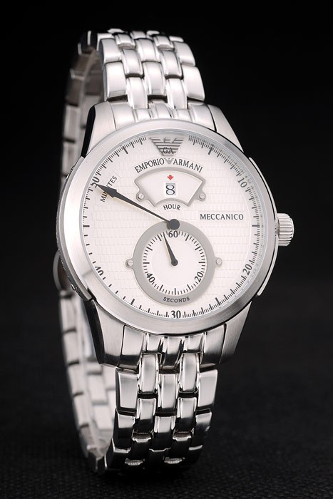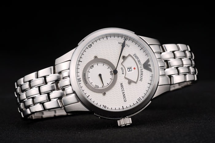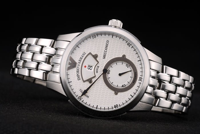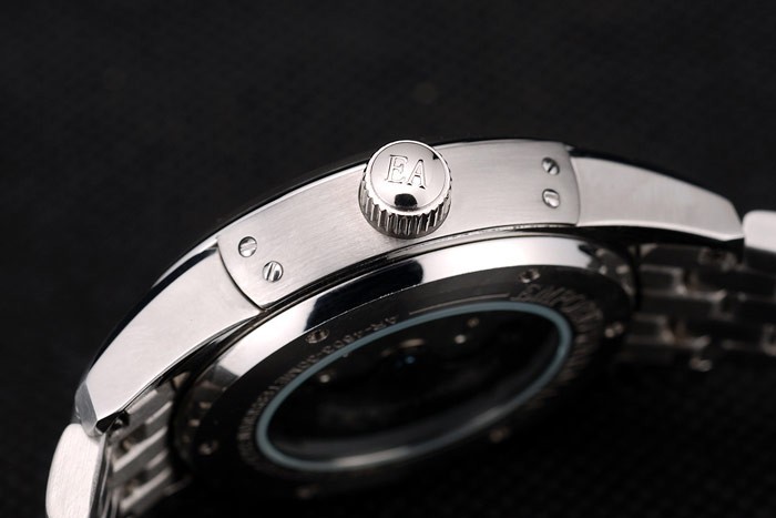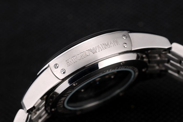 Crown: pulido corona calado de acero inoxidable con perno de cerámica negro y el logotipo de Emporio Armani y dos pequeñas coronas de pulsadores rectangulares a cada lado de it