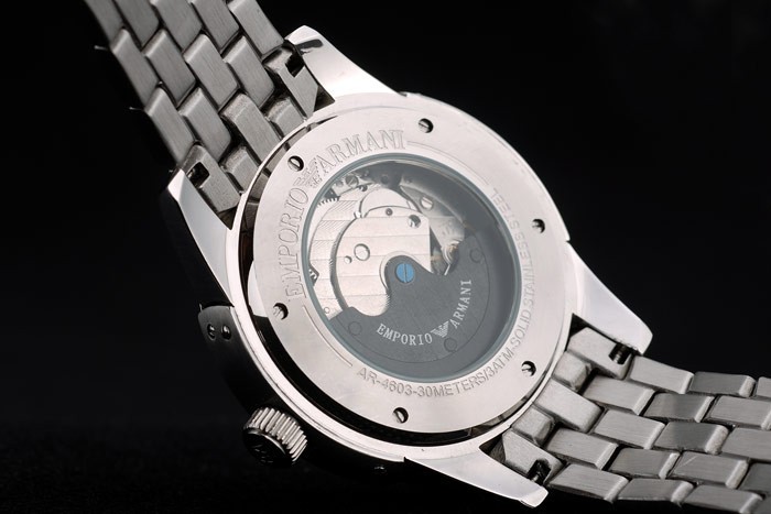 Volver: Acero inoxidable pulido atornillado atrás con transparencia en el centro y Emporio Armani engravings