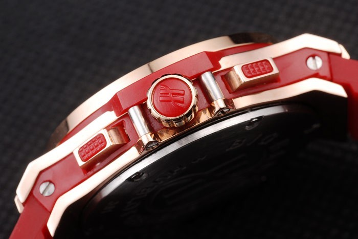 Crown: Cutwork corona de oro rosa con el grabado ‘H’ y dos coronas de pulsadores rectangulares a cada lado , toda tachonada de goma roja trimmings