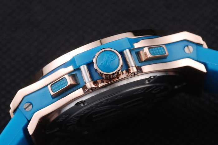 Crown: Cutwork corona de oro rosa con el grabado y dos rectangulares ‘H’ PULSADOR coronas a cada lado, todas tachonada de goma azul trimmings