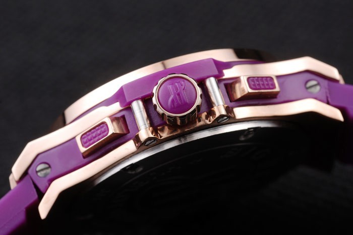 Crown: Cutwork corona con el grabado ‘H’ y dos empuje rectangular de oro rosa coronas de botones en ambos lados, todo salpicado de goma púrpura trimmings
