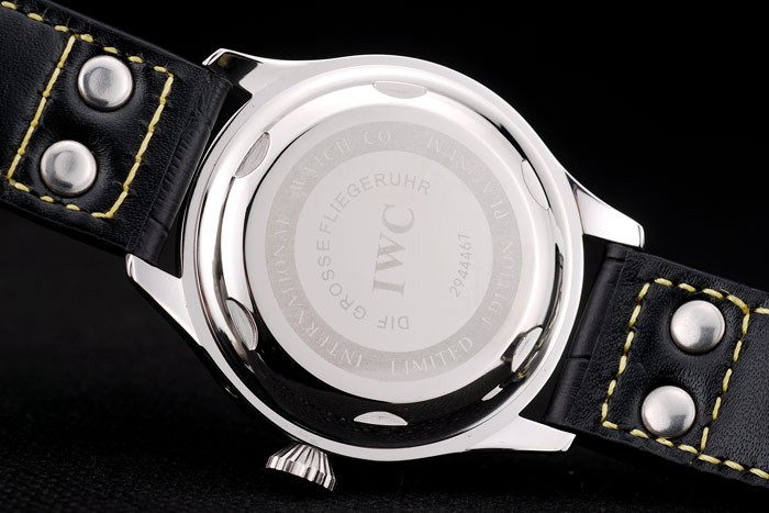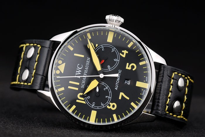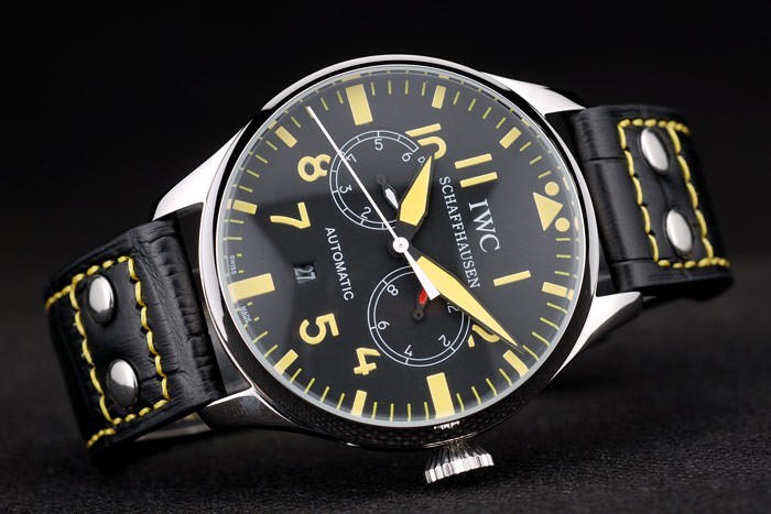 Bracelet acero inoxidable cepillado: Correa CBI calor en relieve de cocodrilo negro de cuero con costuras de hilo amarillo y grabado de acero inoxidable cepillado de gancho CBI clasp