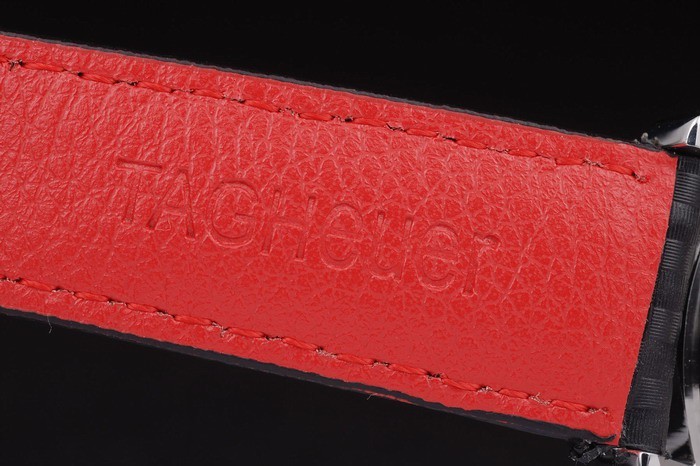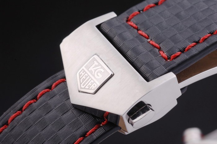 Bracelet acero inoxidable cepillado: correa de cuero Negro con costuras de color rojo y una etiqueta Heuer marcado y cepillado acero Longitud despliegue clasp