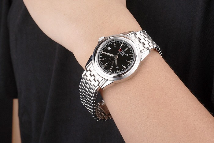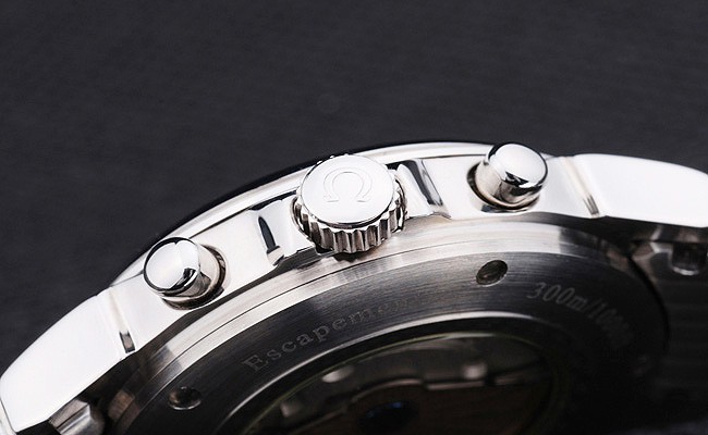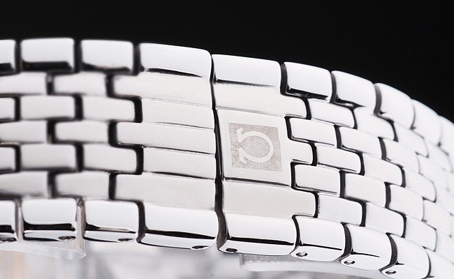 Crown: acero inoxidable pulido corona de calado con el logotipo de Omega más dos coronas adicionales, uno a cada lado de it