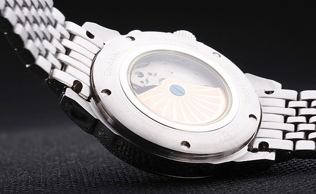 Volver: Acero inoxidable de empuje en el caso de vuelta con inscripciones Omega y transparencia en el centro revela que la mecánica within