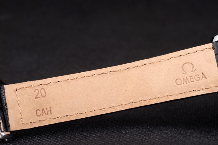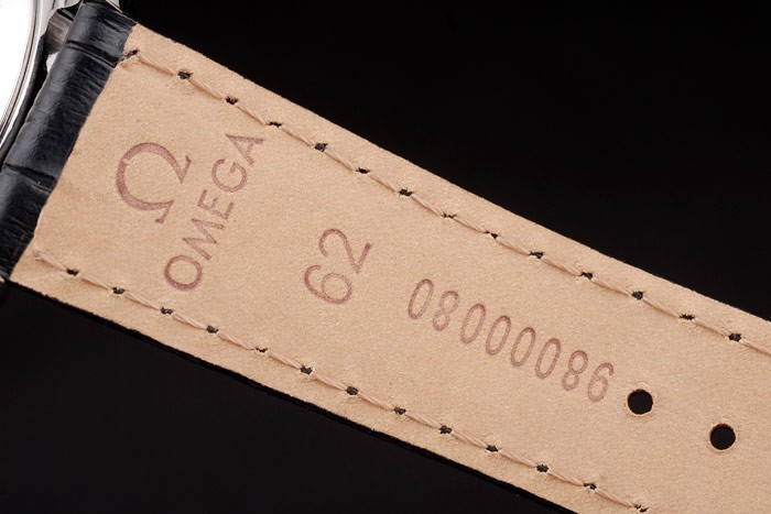 Bracelet de acero inoxidable: correa de piel de cocodrilo Negro con relieve de calor sello de Omega y acero inoxidable plegado hacia dentro del corchete con logotipo de Omega en top
