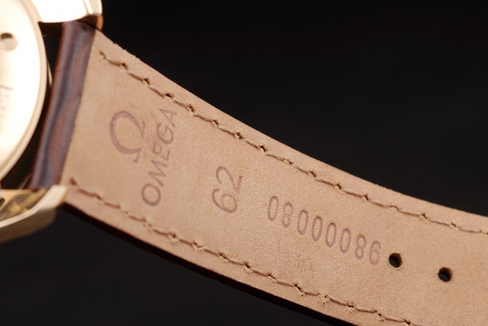 Bracelet: correa de piel de cocodrilo marrón con relieve de calor sello de Omega y Omega inscrito 18k oro amarillo plegable en clasp