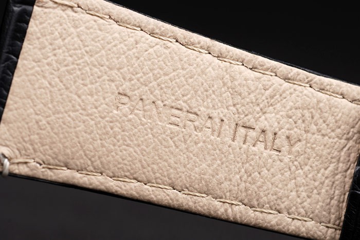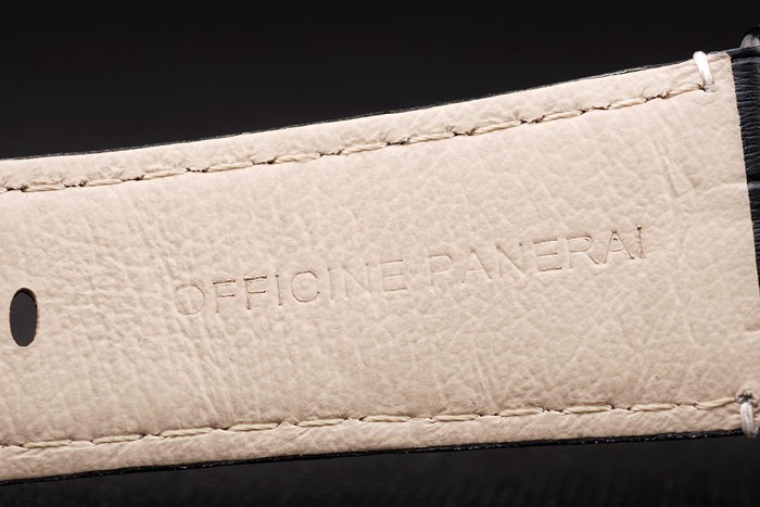 Bracelet de acero inoxidable: correa de piel de cocodrilo negro con costuras en blanco y calor en relieve Officine Panerai Italia sello y cierre de gancho hebilla de ión-plateado con Panerai engraving