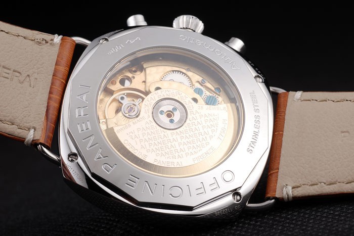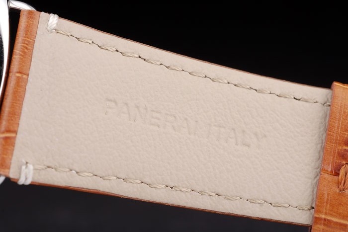 Bracelet de acero inoxidable: correa de piel de cocodrilo marrón con costuras blancas y el calor en relieve sello de Officine Panerai Italia y acero inoxidable pulido broche de gancho de la hebilla con Panerai engraving