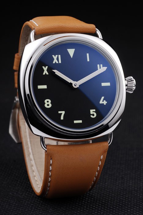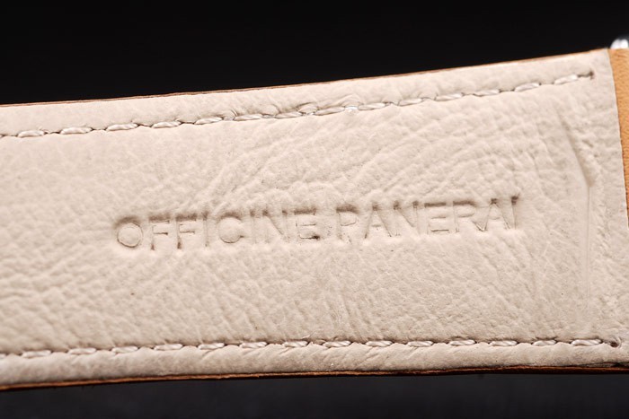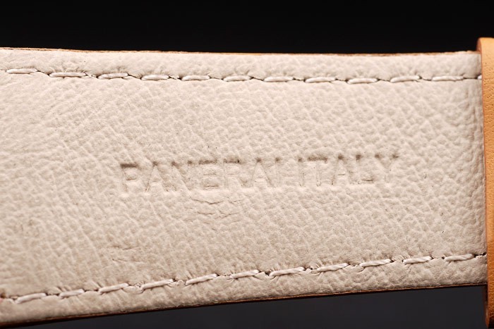 Bracelet de acero inoxidable: correa de cuero marrón claro con costuras de color blanco y en relieve de calor sello de Officine Panerai Italia y pulida de acero inoxidable gancho hebilla de cierre con Panerai engraving