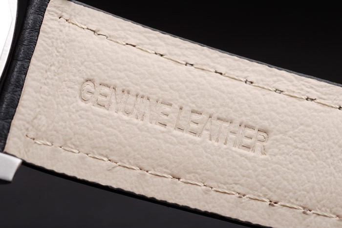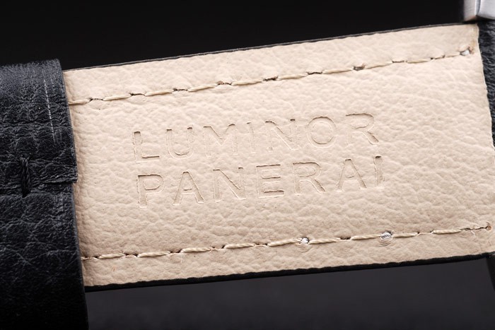 Bracelet acero inoxidable cepillado: correa de cuero Negro con costuras de color blanco y en relieve de calor sello Luminor Panerai y acero inoxidable cepillado de gancho hebilla de cierre con Panerai engraving