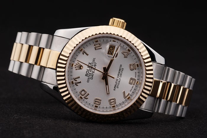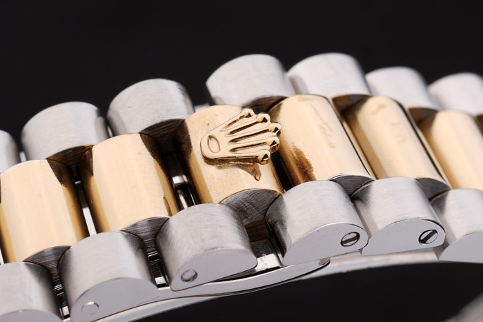 Color japonesa: acero inoxidable cepillado y amarillo cadena de eslabones de oro con el doblez sobre el corchete y Rolex corona engraving