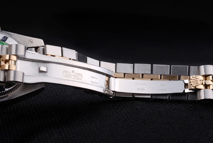 Bracelet de acero inoxidable: Dos brazalete de eslabones de tonos de acero inoxidable cepillado y oro amarillo de 18K chapado en acero con cierre oculto grabado Rolex mostrando la longitud Rolex logo