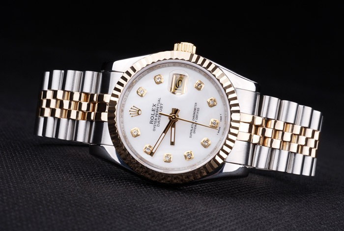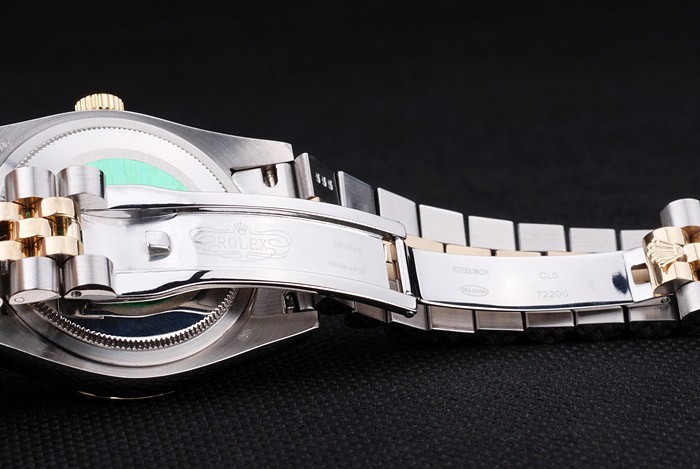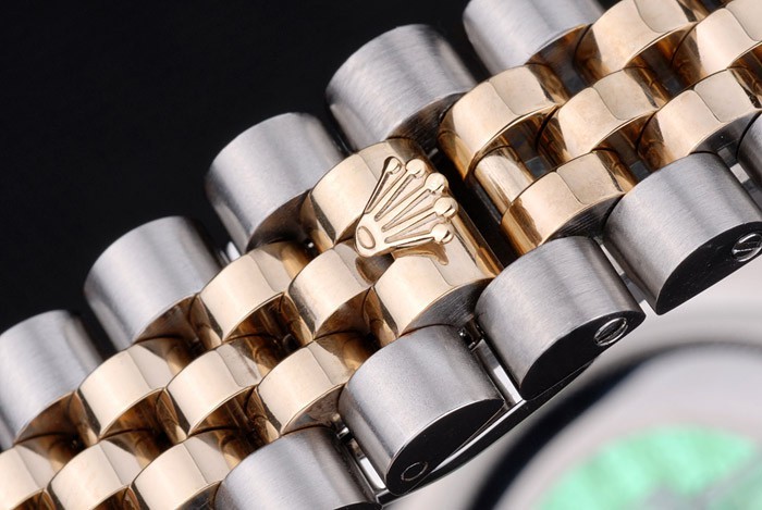 Bracelet de acero inoxidable: Dos brazalete de eslabones de tonos de acero inoxidable cepillado y oro amarillo de 18K chapado en acero con cierre oculto grabado Rolex mostrando la longitud Rolex logo