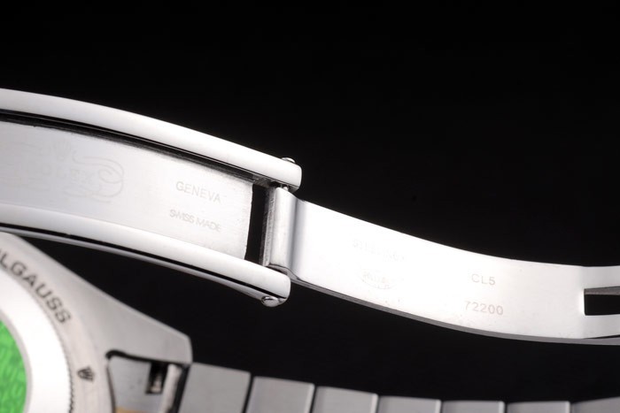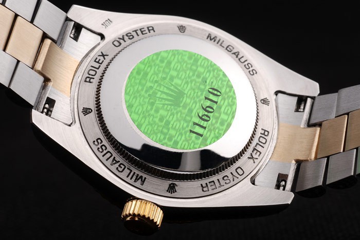 Volver: Acero inoxidable empuje en caso de vuelta con el verde sello Rolex logotipo y Rolex Oyster Milgauss engraving