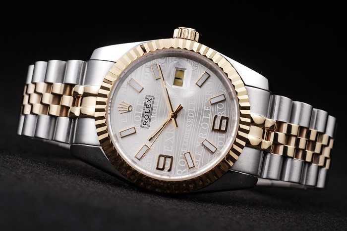 Bracelet de acero inoxidable: Acero Dos brazalete de eslabones de tonos de acero inoxidable cepillado y oro amarillo de 18K plateado con Rolex grabado cierre oculto mostrando la longitud Rolex logo