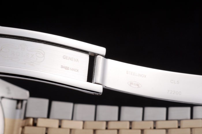 Bracelet de acero inoxidable: Acero Dos brazalete de eslabones de tonos de acero inoxidable cepillado y oro amarillo de 18K plateado con Rolex grabado cierre oculto mostrando la longitud Rolex logo