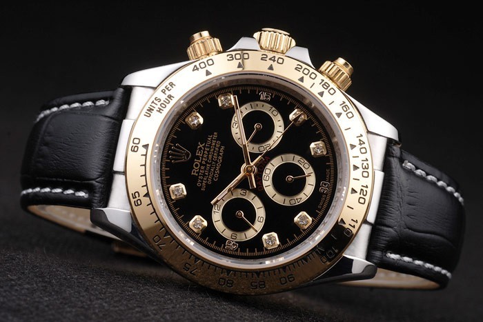 Bracelet acero inoxidable cepillado: correa de cuero Negro cocodrilo con Rolex grabado 18k oro amarillo plegable en cierre desplegable que muestra la Rolex logo