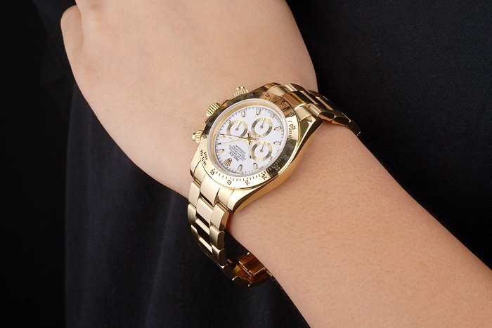 Crown: entonadas oro corona de calado con el logotipo de Rolex y dos coronas adicionales en cada lado de it