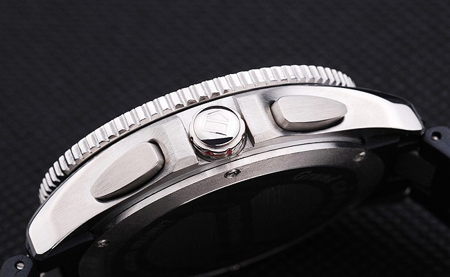 Crown: pulido corona calado de acero inoxidable con logo TAG Heuer más dos coronas adicionales a cada lado y una en el Espesor superior opuesta corner